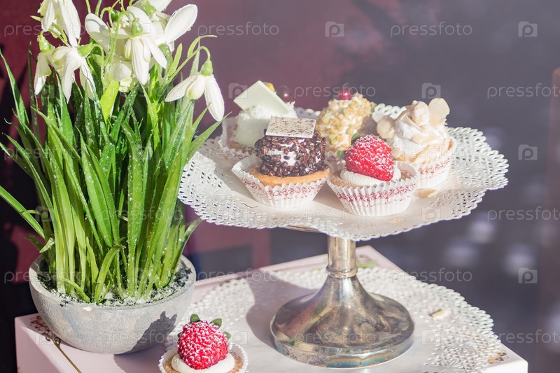 Тарелка с десертами и подснежниками на столе