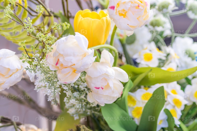 Крупный план для цветущих искусственных цветов, красочный цветочный фон