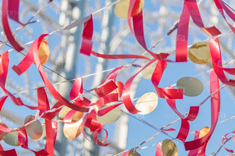 Красные полоски ткани висят на веревке на фоне голубого неба
