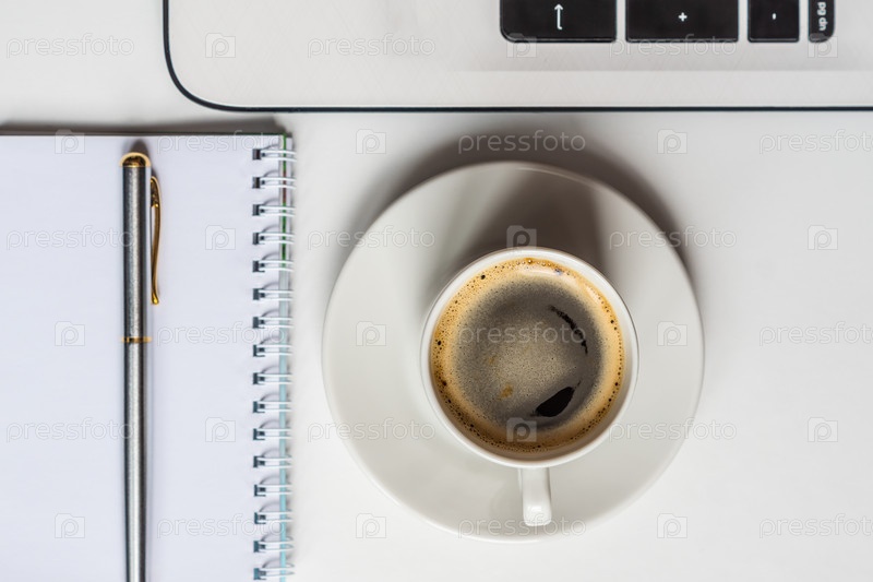Вид сверху на белый офисный стол с белым ноутбуком, ноутбуком, металлической ручкой и чашкой черного кофе. Бизнес-концепция