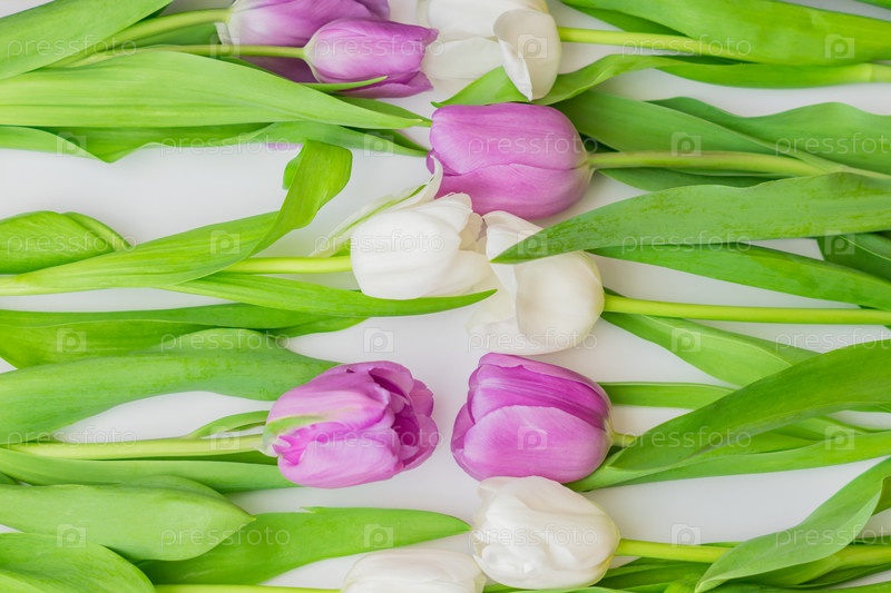 Вид сверху на фиолетовые и белые тюльпаны на белом фоне