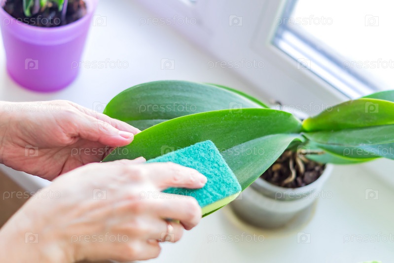 Женщина вытирает зеленые листья цветка орхидеи зеленой губкой. Уборка дома и концепция домашних брюк
