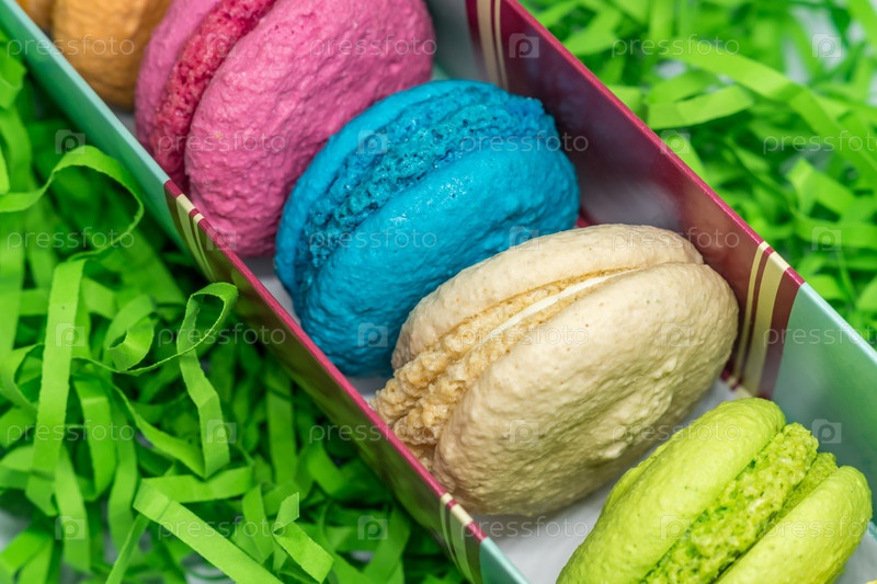 Французские нежные десертные миндальные печенья разных цветов на зеленых полосках бумаги