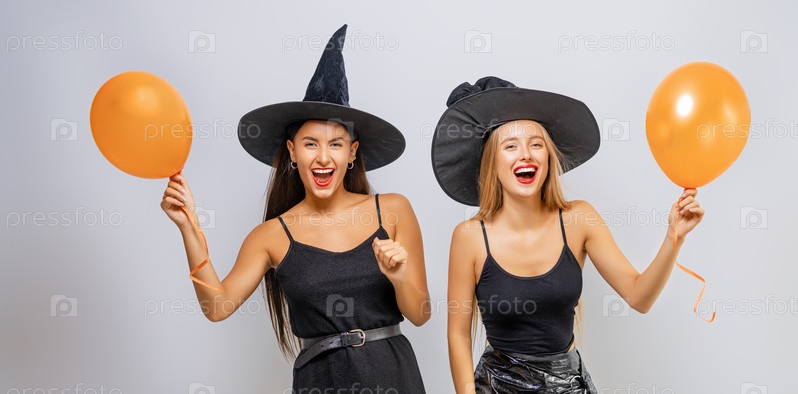 Две молодые женщины в костюмах черных ведьм