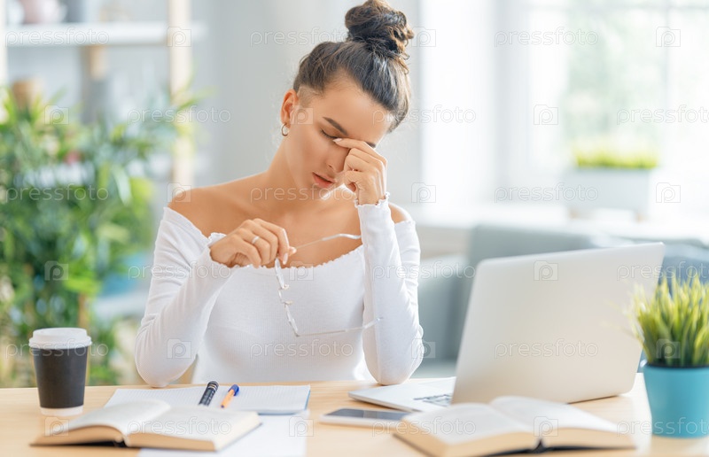 Молодая женщина учится и у нее болит голова