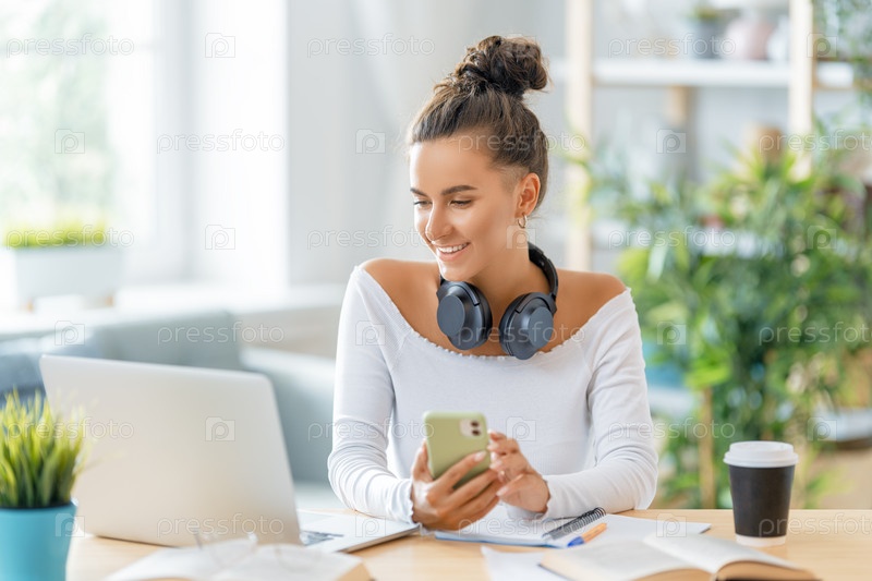 Женщина работает на ноутбуке дома
