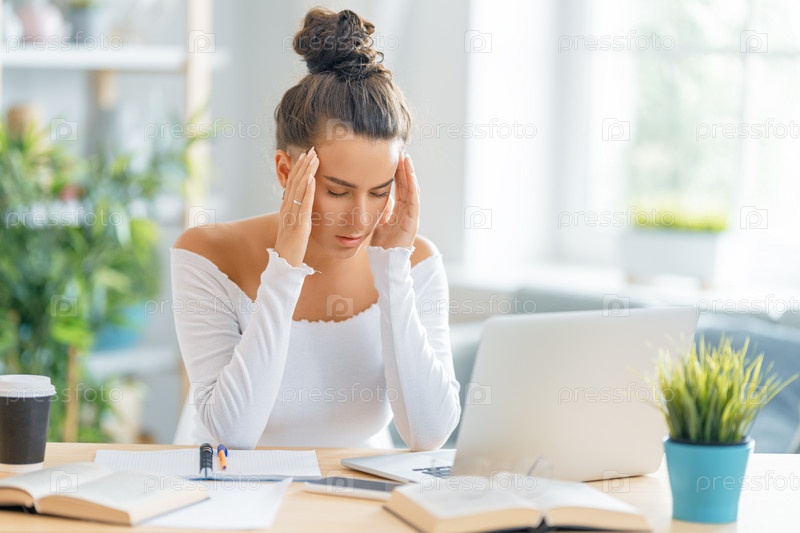Молодая женщина учится и у нее болит голова