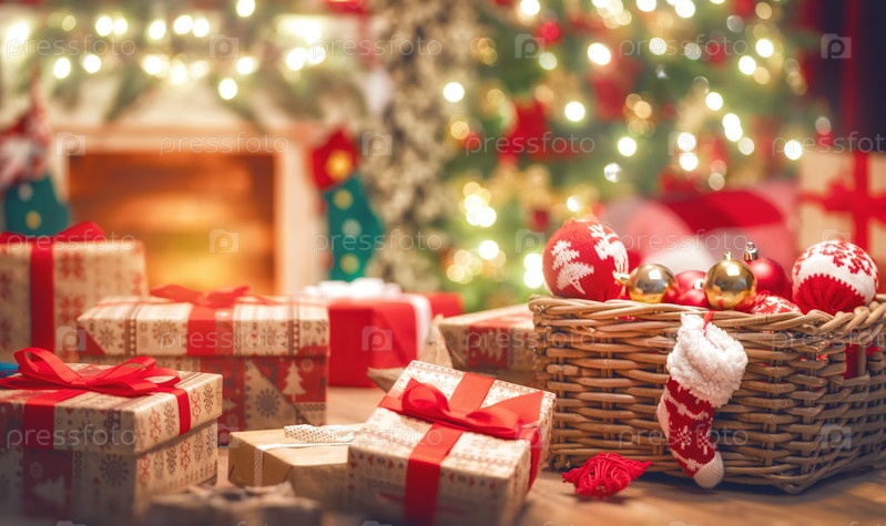 Подарочные коробки в украшенном зале