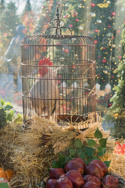 Белый петух в металлической клетке - декоративная инсталляция