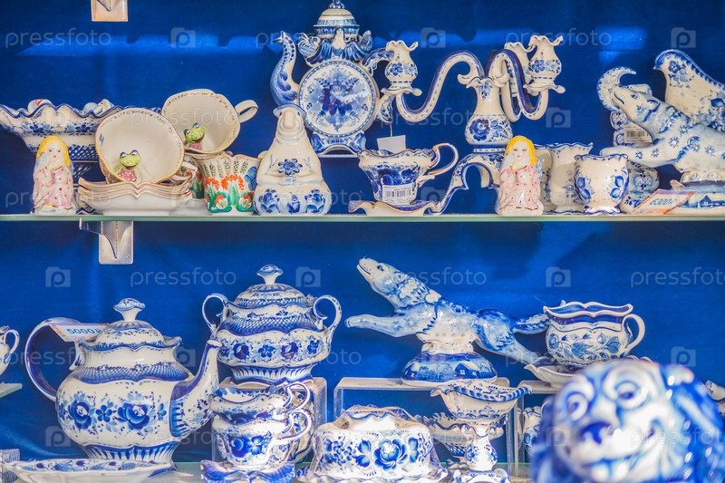 МОСКВА, РОССИЯ - 10 ЯНВАРЯ 2018 г.: Красочная фарфоровая посуда и сувениры в стиле гжель на рынке. Традиционный русский сувенир
