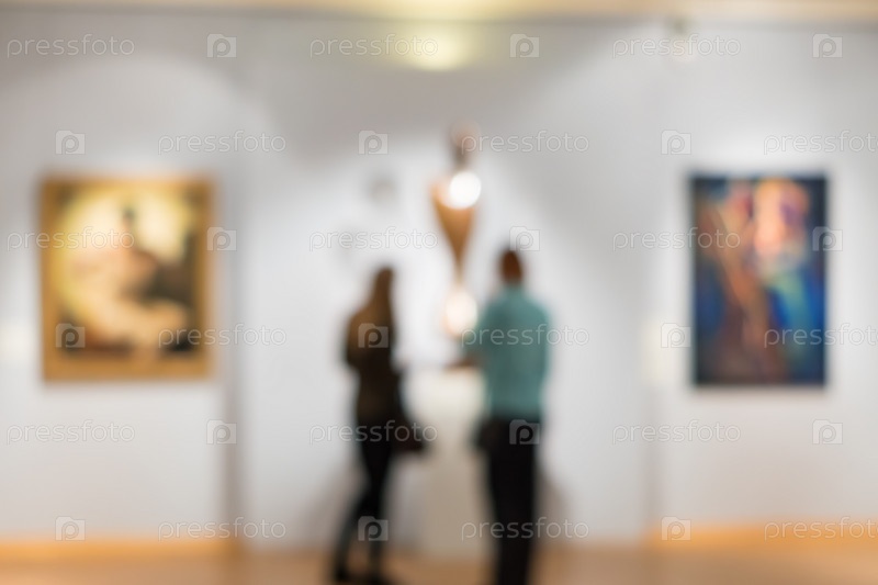 Две женщины смотрят на картины в музее, расфокусированное изображение