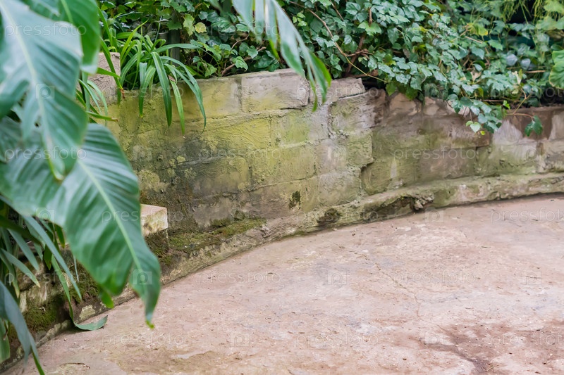 Кирпичная каменная стена в тропическом саду. Природный пейзаж