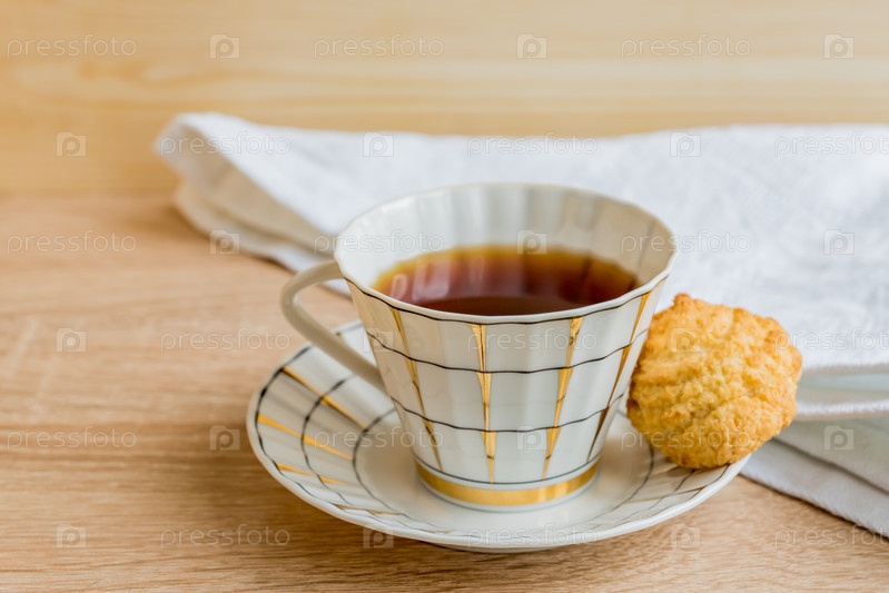 Черный чай в золотисто-белой чашке с кокосовым печеньем на деревянном столе крупным планом