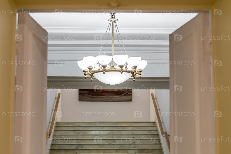 Открытые деревянные двери и старинная роскошная люстра над лестницей