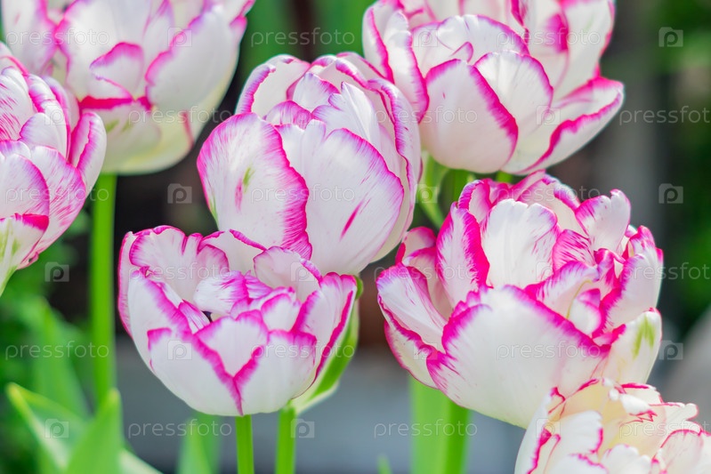 Белые и розовые цветущие тюльпаны крупным планом, цветочный фон