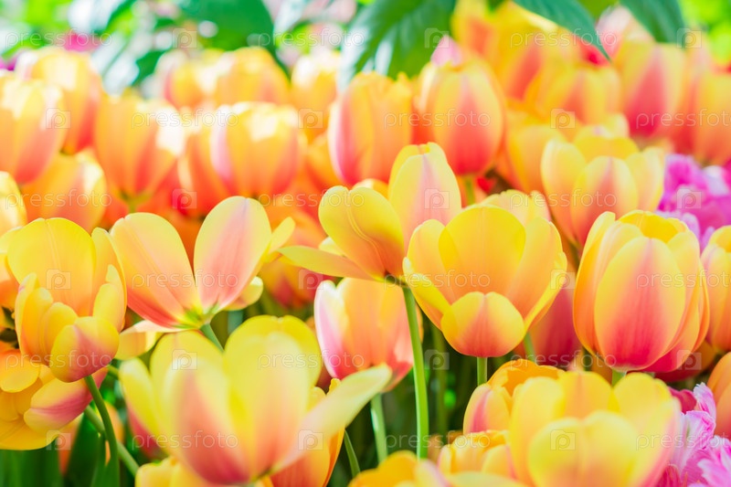Цветущее поле красных и желтых тюльпанов, цветочный фон