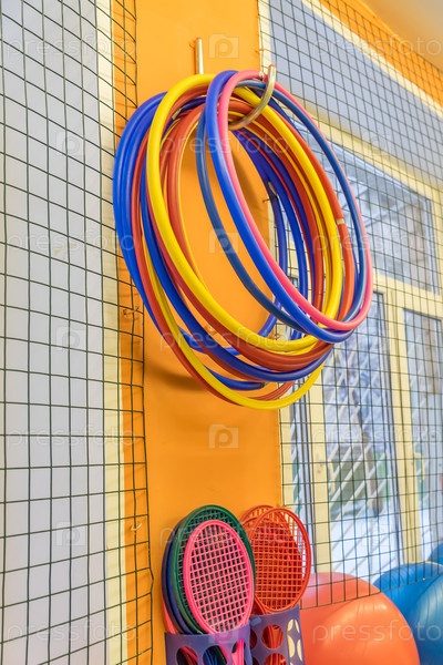 Спортивный инвентарь - обруч, теннисная ракетка, фитбол в тренажерном зале