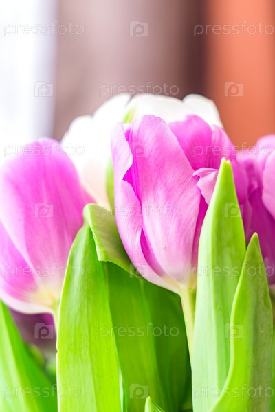 Крупный план букета белых и фиолетовых тюльпанов
