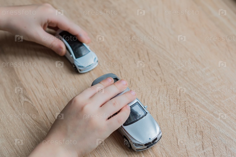 Москва, Россия - 17 февраля 2018 г.: Маленький мальчик играет в машинки на деревянном столе