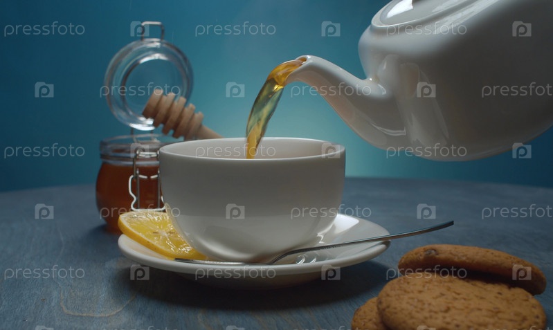 Горячий чай льется в чашку