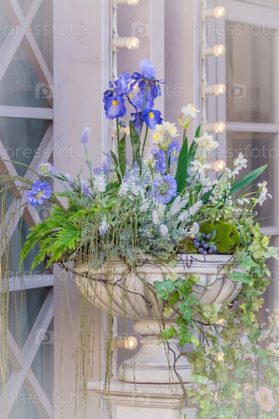 Цветущие цветы в большой вазе на улице в солнечный день, свадебное украшение