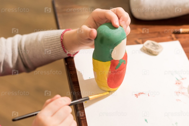 Маленькая девочка раскрашивает русскую матрешку желтой краской
