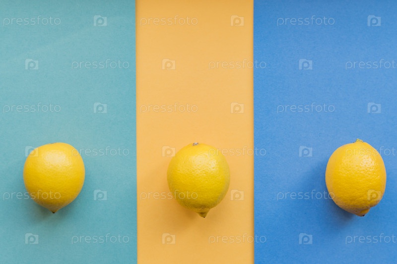 Вид сверху на три лимона на пастельном разноцветном фоне