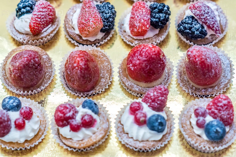 Различные виды маленьких сладких пирожных с ванилью, шоколадом, ягодами и сахарной пудрой. Выборочный фокус