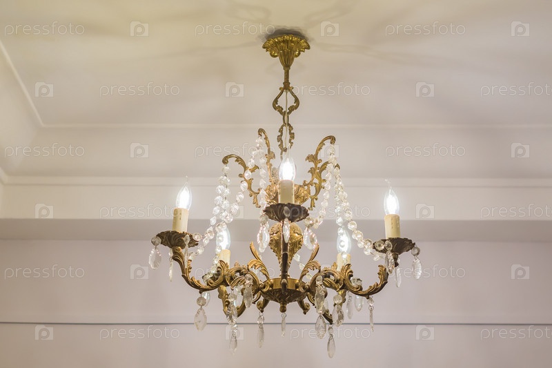 Винтажная люстра висит под белым потолком с лепниной