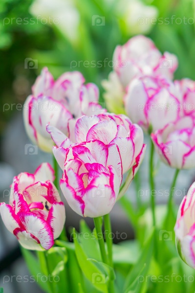 Белые и розовые цветущие тюльпаны крупным планом, цветочный фон
