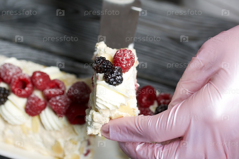 Женщина режет торт. Руки в резиновых перчатках. Рулет безе с кремом из маскарпоне. Украшается малиной и миндальными лепестками. Крупный план