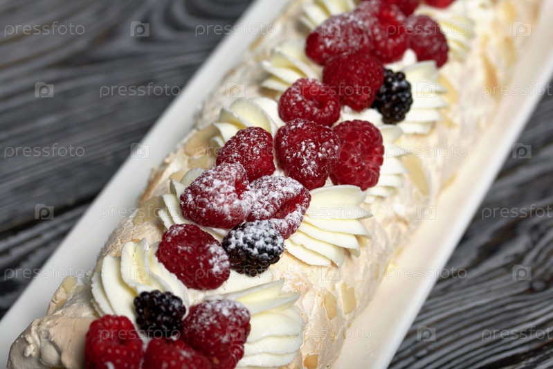 Рулет безе с кремом из маскарпоне. Украшается малиной и миндальными лепестками. Крупный план