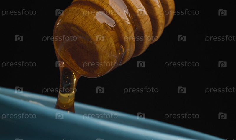 Крайне крупный план свежего меда, льющегося из медовой ложки в банку на черном фоне. Концепция здоровых свежих продуктов. Макро, голландский угол