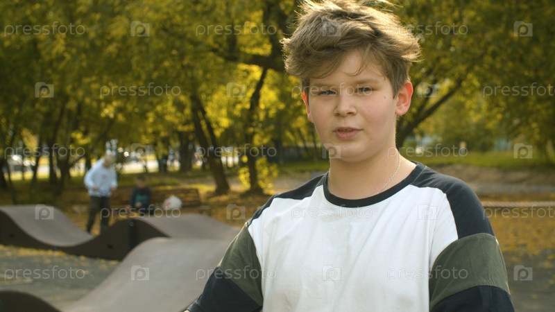 Портрет мальчика на фоне парка возле насосной дорожки. Детский спорт и концепция здорового образа жизни