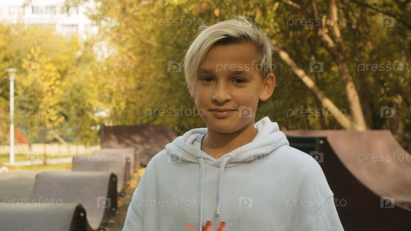 Портрет улыбающегося мальчика на фоне парка. Летний день, памп-трек