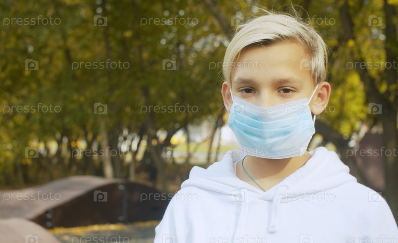 Портрет подростка в медицинской маске. Защита от вирусной эпидемии в городе. Здравоохранение, медицинское обслуживание и безопасность, вирус гриппа, пандемия