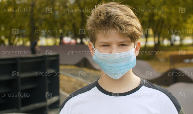 Портрет подростка в медицинской маске. Защита от вирусной эпидемии в городе. Здравоохранение, медицинское обслуживание и безопасность, вирус гриппа, пандемия