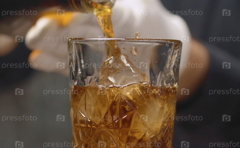 Приготовление коктейля Лонг-Айленд со льдом. Закройте руки бармена, наливая холодный чай в хрустальный стакан со льдом