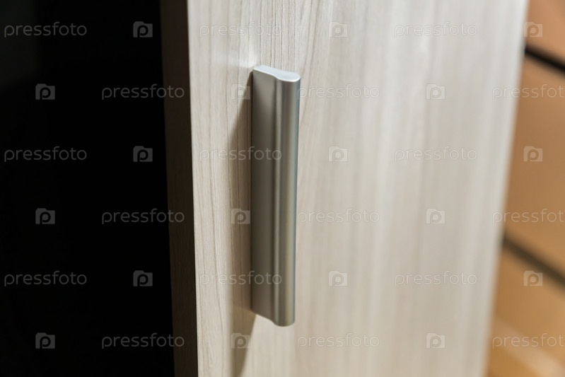 Открытая дверца шкафа. Крупный план деревянной двери с металлической ручкой