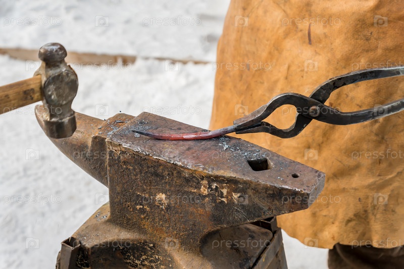Кузнец вручную кует расплавленный металл на наковальне под открытым небом