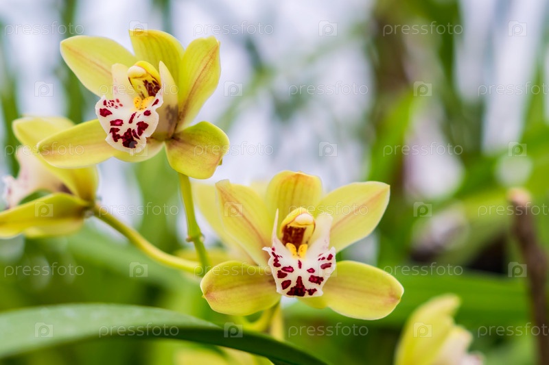 Желтый экзотический цветок орхидеи крупным планом, мягкий фокус