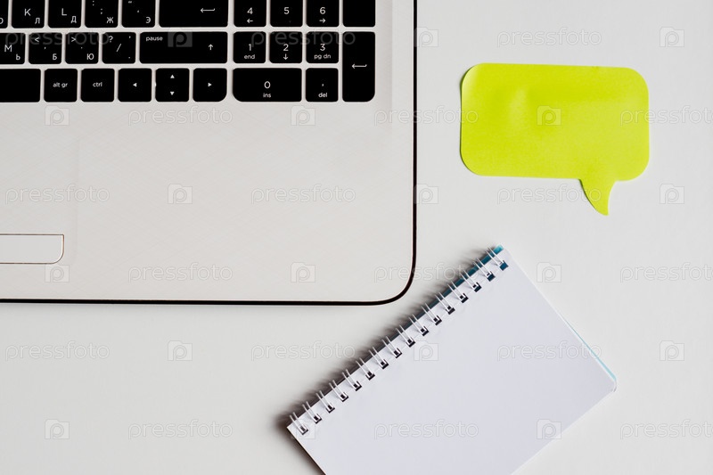 Крупный план белого офисного стола с ноутбуком, желтой наклейкой для заметок и блокнотом. Вид сверху с копией пространства