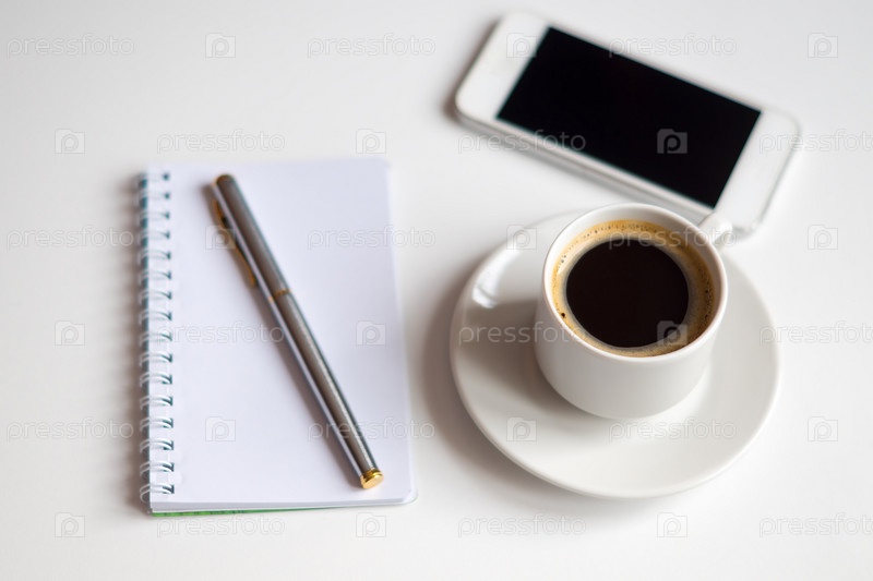 Чашка черного кофе, блокнот, серебряная ручка и белый смартфон на белом фоне,