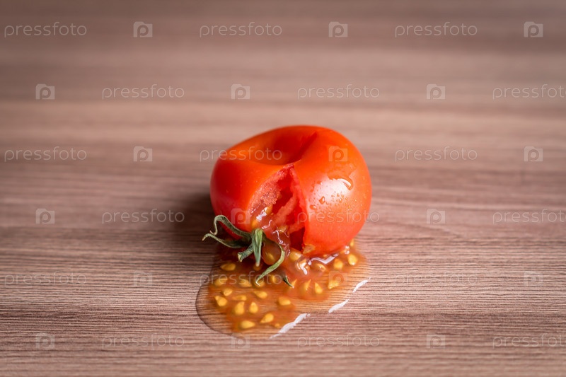 Разбитый помидор на деревянном столе