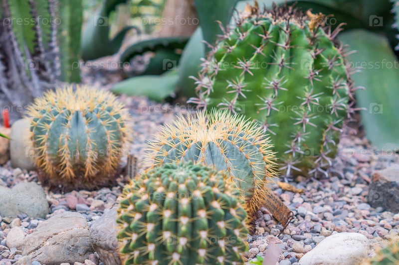 Кактусы в форме шара на открытом воздухе. Дизайн сада