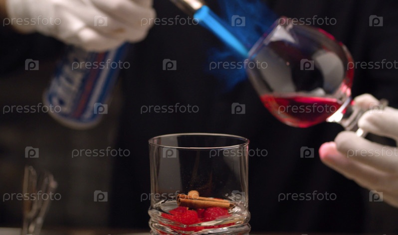 Изготовление малиновой самбуки. Крупным планом рука бармена поджигает самбуку в снифтере