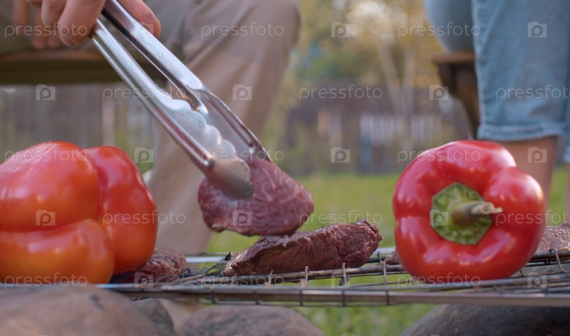 Рука кладет кусок мяса на гриль для барбекю на открытом воздухе