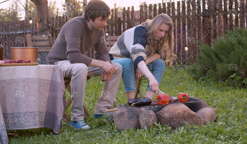 Женщина переворачивает куски мяса на гриле для барбекю на открытом воздухе
