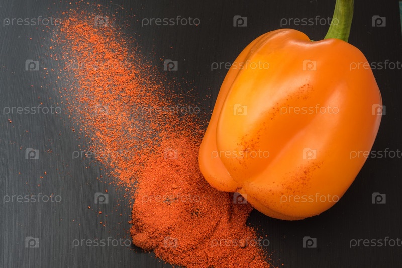 Оранжевый сладкий перец и порошок паприки на черном фоне, вид сверху