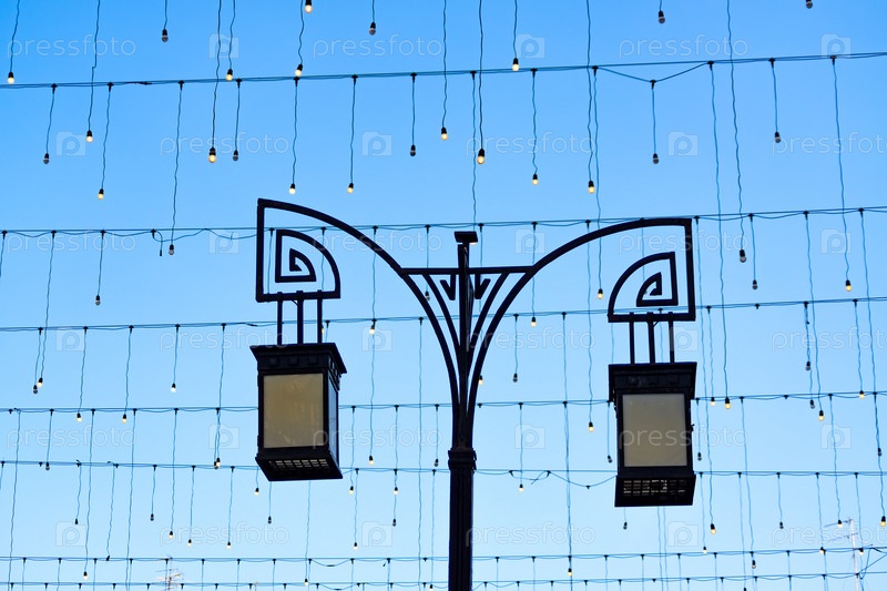 Фонарь на фоне гирлянды и вечернем небе